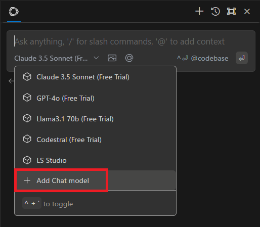 Continueのモデル選択画面で「Add Chat model」をクリックする。