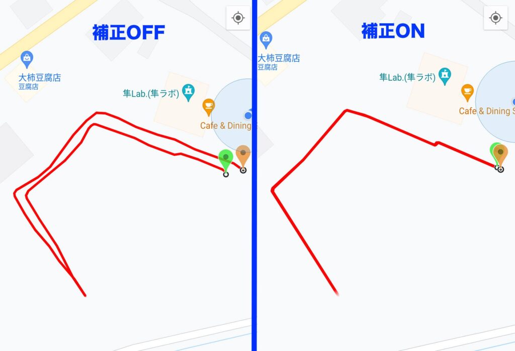 「補正OFF」はスマートフォンのGPSのみで測定した結果です。往復でずれています。