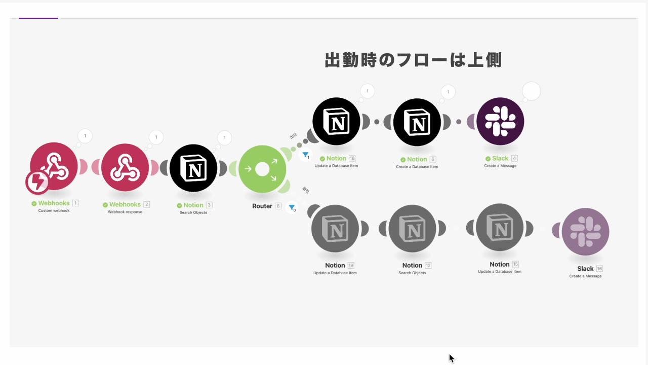 今回の処理では出勤時には上側のフローが動作し、退勤時には下側のフローが動作します。