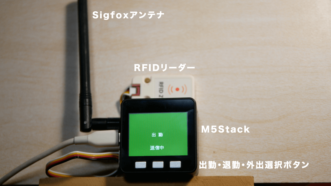 M5StackにICカードのデータを読み取るRFIDリーダーを接続。読み取ったデータをSigfoxモジュールを利用して送信します。