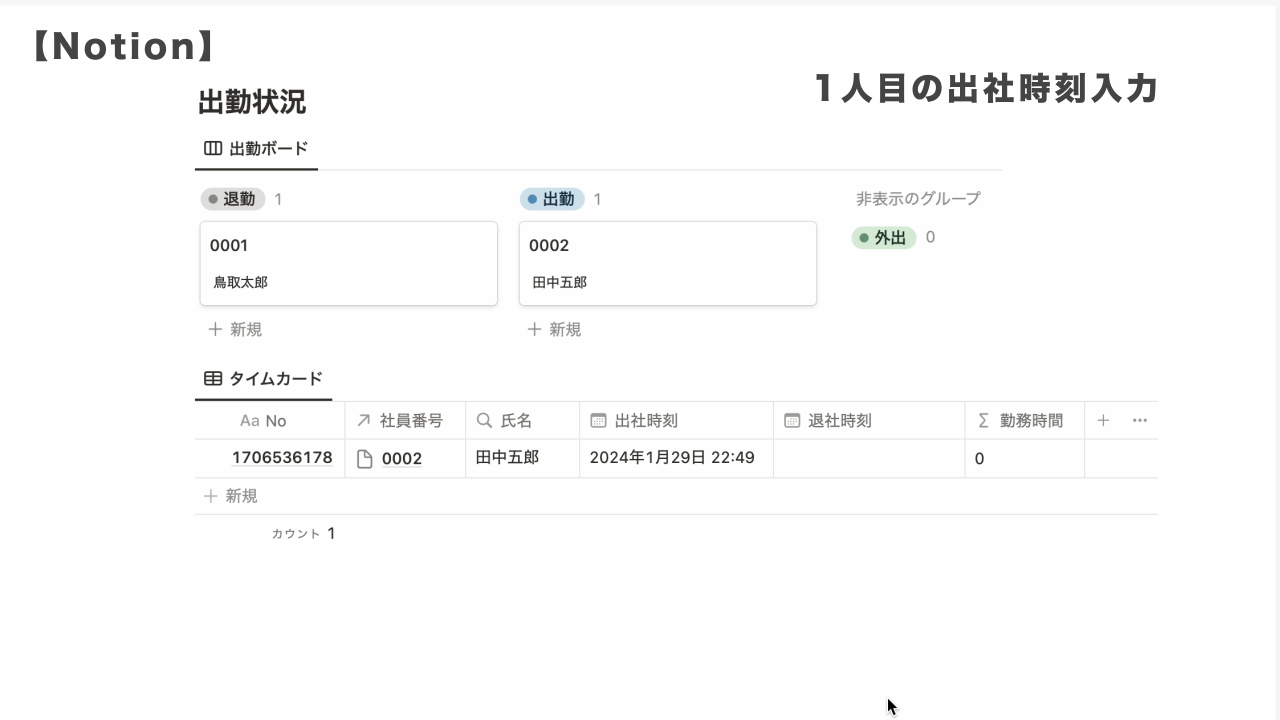 出勤ボードは従業員名簿のデータベースをボード形式で表示したもの、タイムレコーダー部分は出勤簿データベースをテーブルビューで表示したものです。