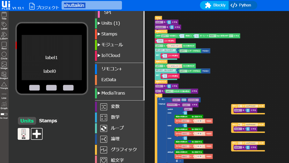 IoTデバイスの本体にはM5Stackを利用しました。M5Stackのソフトウェア(ファームウェア)はUIFlowというノーコードツールを利用して組んでいます。