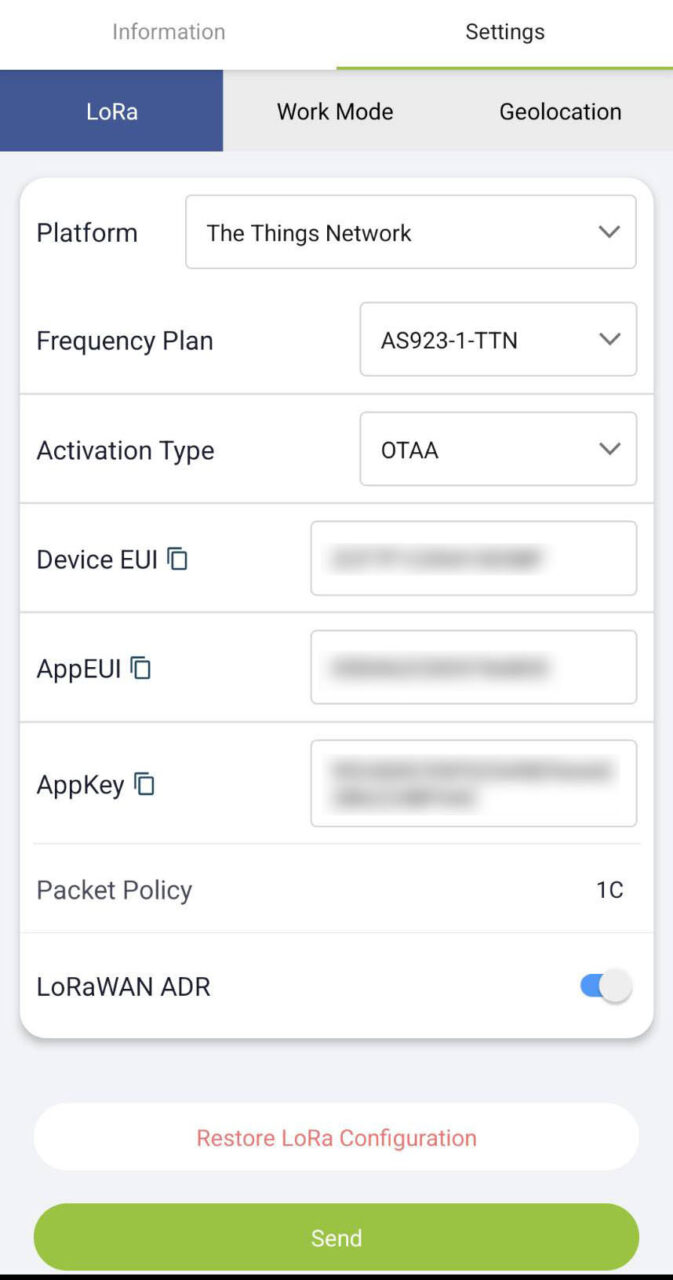 LoRa設定では、PlatformにてThe Things Networkを選択し、表示される、Device EUI、AppEUI、AppKeyをコピーして控えてください。