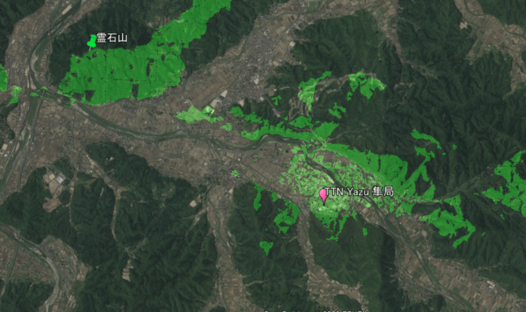 どちらの結果も、建物等の障害物は考慮されておらず地形データのみでのシミュレーションですので、八頭町のような田舎でしたらある程度参考になるかもしれませんが、都市部だともう一工夫必要だと思います。