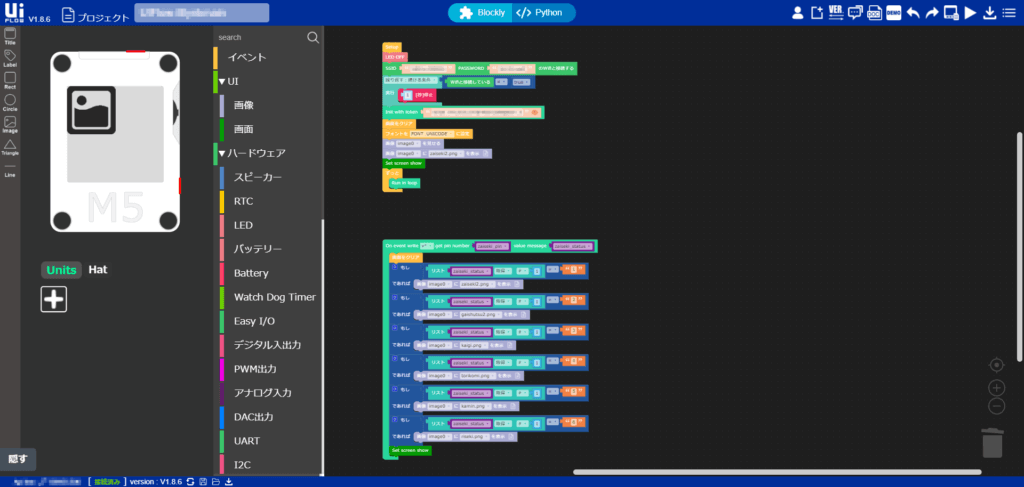 プログラミングはWebブラウザからUIFlowという専用の開発環境を使ってScratchのようなブロックプログラミングが可能です。