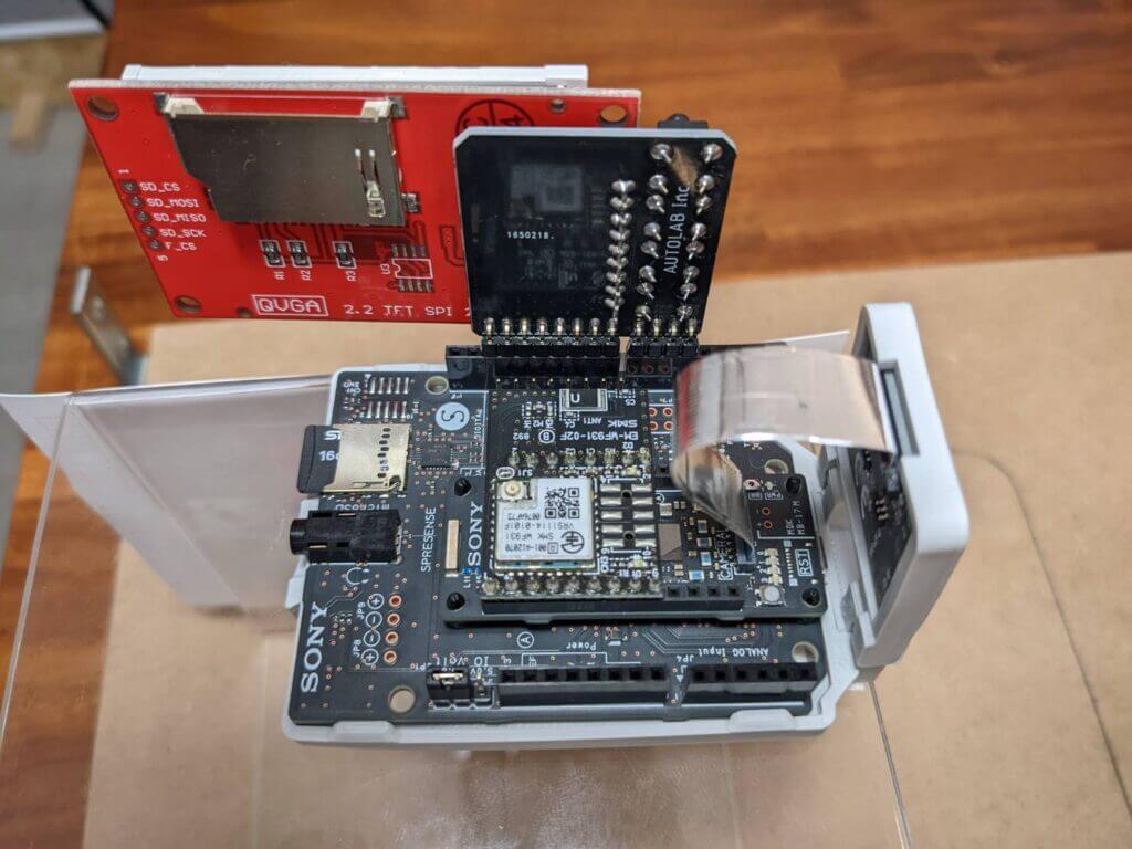 SpresenseにカメラやAdd-Onボードなどを装着したデバイスがこちらです。