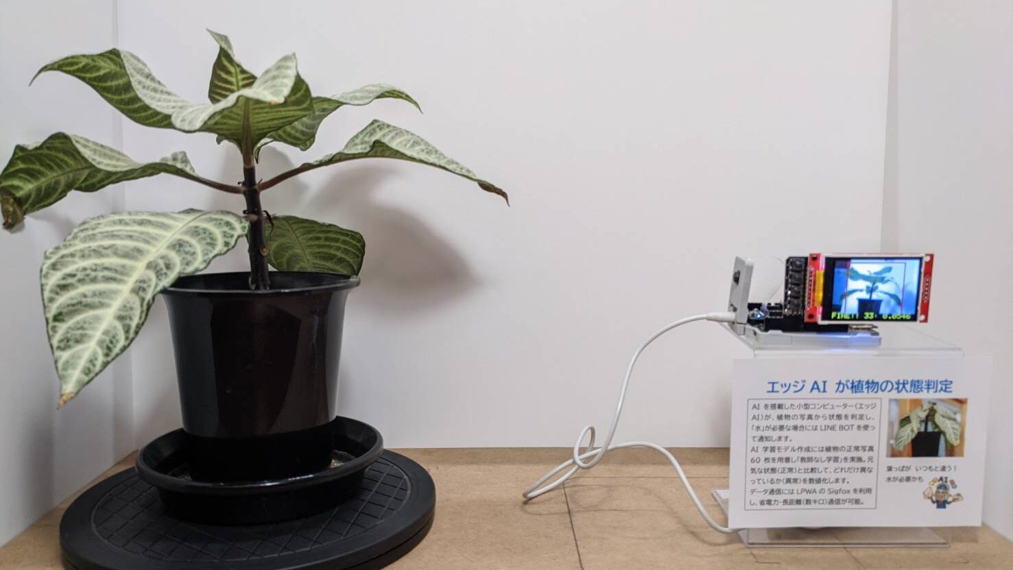 AIの実証実験として、観葉植物の状態をエッジAIにて監視し、普段と異なる状態(水不足など)になった際にLINE BOTにて通知するシステムを作成しました。