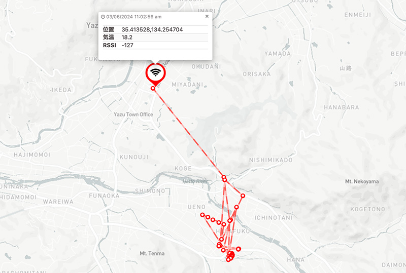 自動車にGPSトラッカーを乗せて移動したところ、ゲートウェイから直線距離で3.2km地点でも通信できることを確認しました。