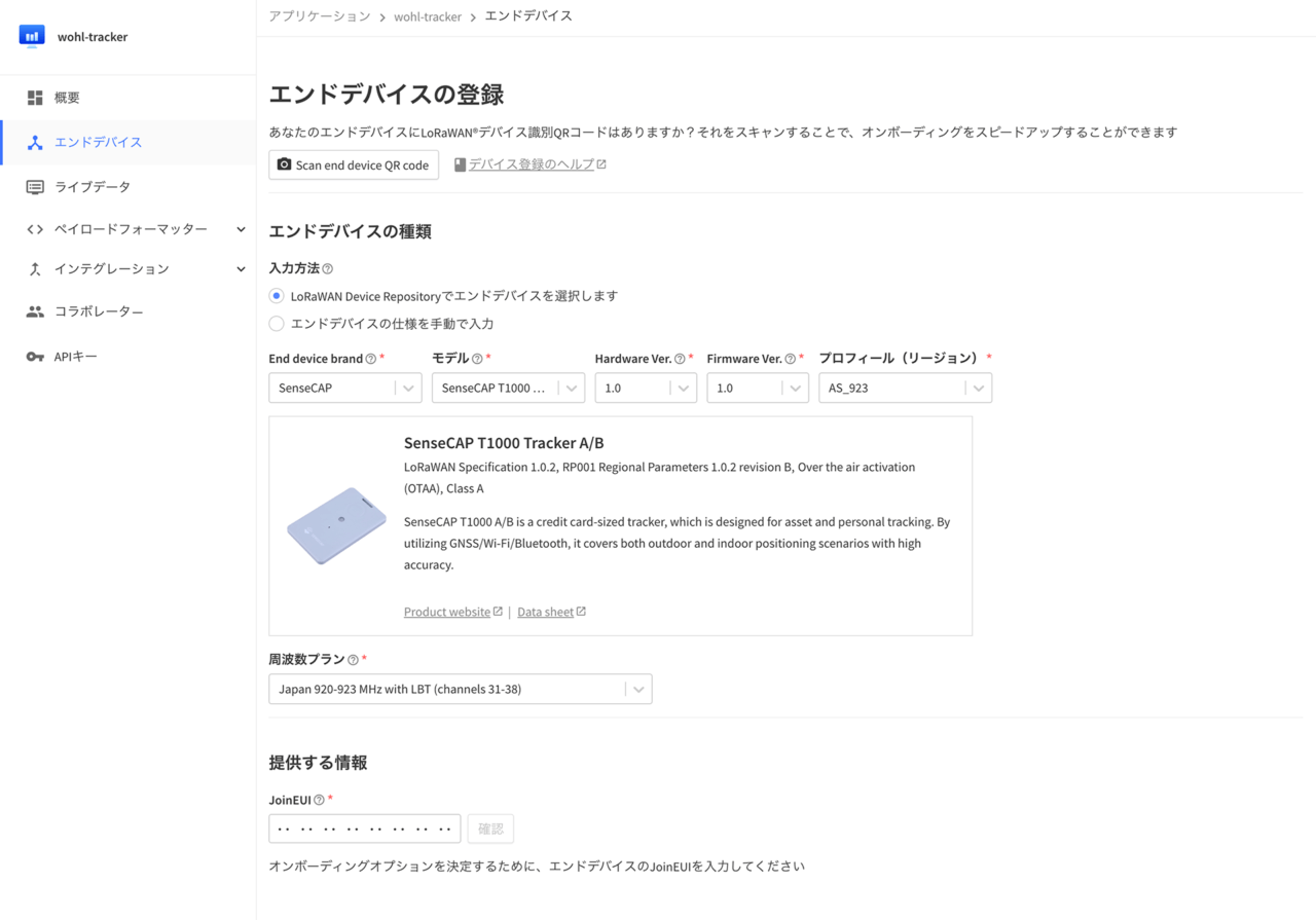 JoinEUIは、スマホアプリで設定した際に控えたAppEUIを設定します。
