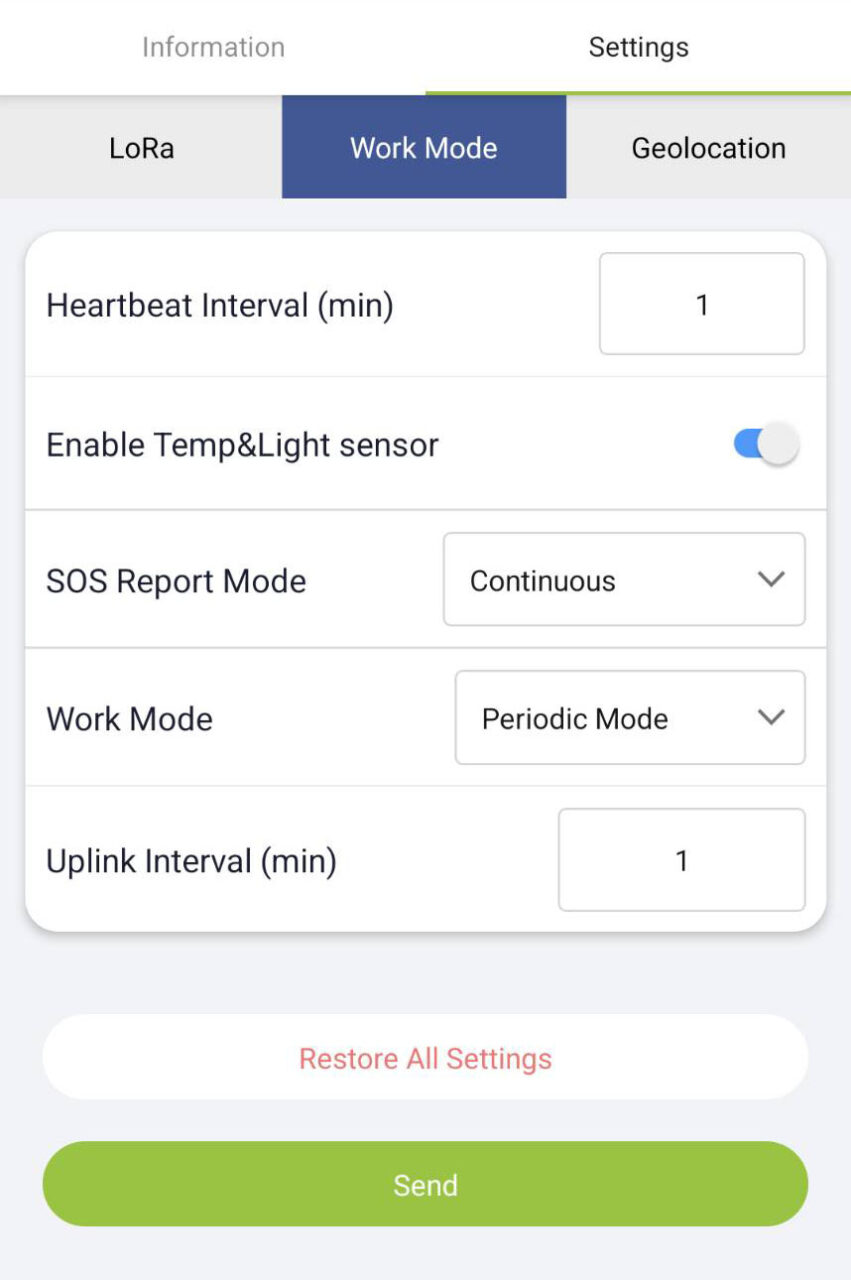 Work Modeを変更すると、モーションセンサーが動きを検知した場合にデータを送信する等の設定もできるようですが、未検証です。