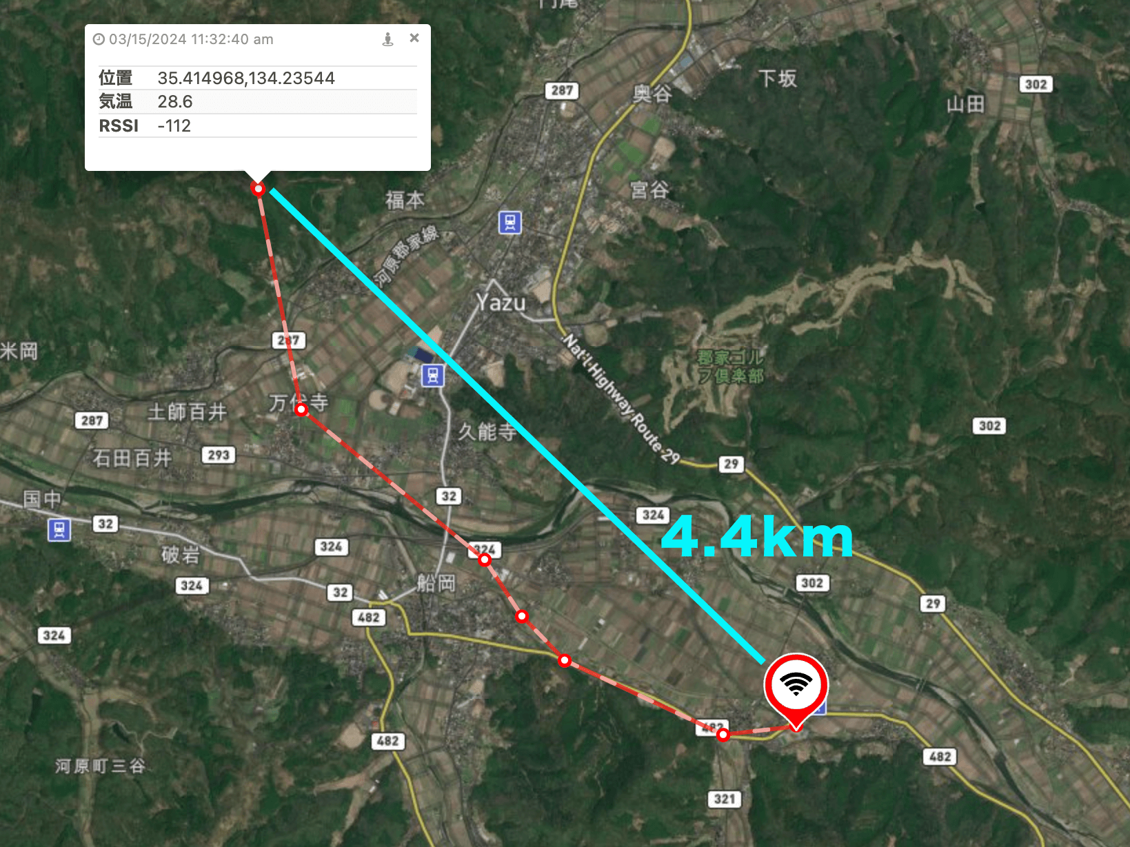 今回の通信実験では、直線距離4.4kmの地点からのデータ送信に成功しました。