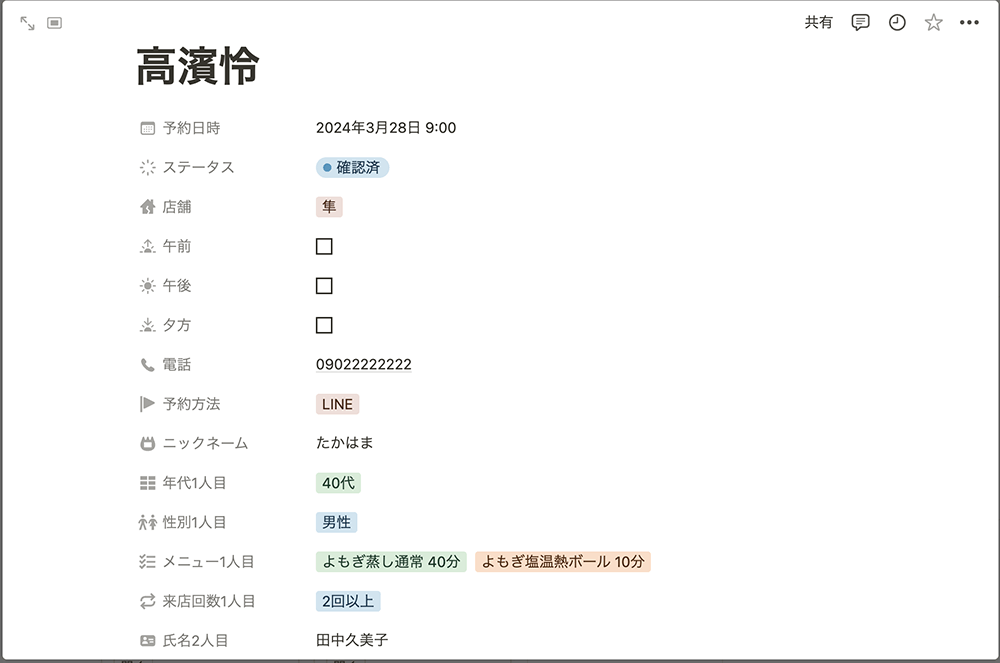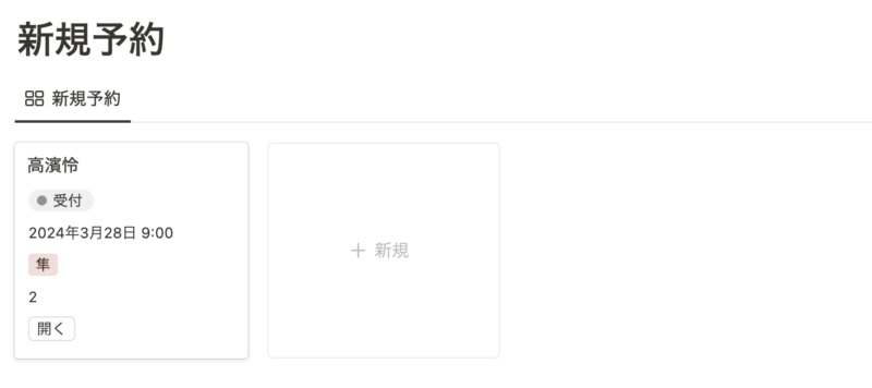 - Notionのデータベースで予約情報をクリックすると、詳細情報が表示されます。