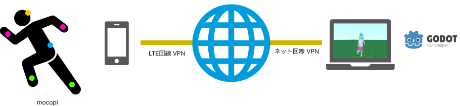 次の動画はVPNでの動作検証です。Wifiが届かない範囲でもモーションキャプチャ可能であることを確認できました。今回は使用したPCのスペックが低かったため、Godotでの3Dモデル表示と画面の録画を行うと処理が重くなり、録画がコマ落ちしてしまいました。実際のモーションキャプチャアニメーションはもっとスムーズに動作しました。ただし、携帯回線がIoT用の低速度の回線であったことと無料のVPNサービスを利用したため、おそらく通信速度があまり出ておらず時々、コマ落ちしました。