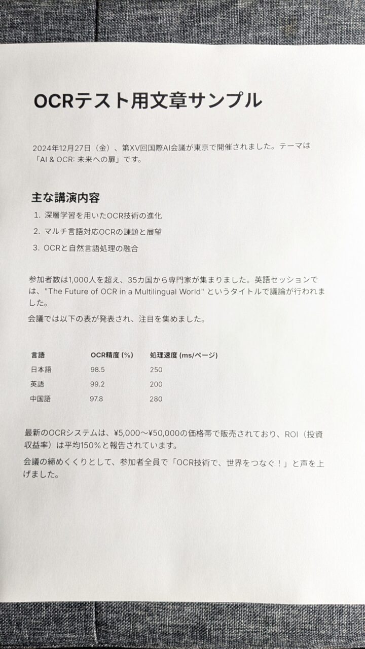 生成AIに認識テスト用の文章を考えてもらい、それを紙に印刷してスマホのカメラで適当に撮影した画像を使いました。