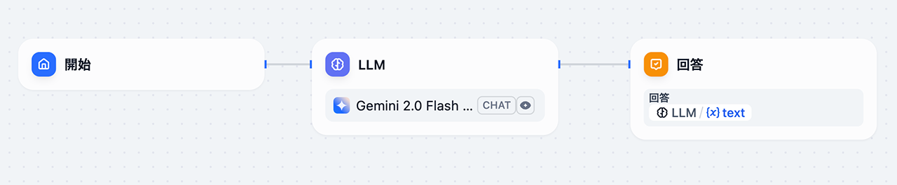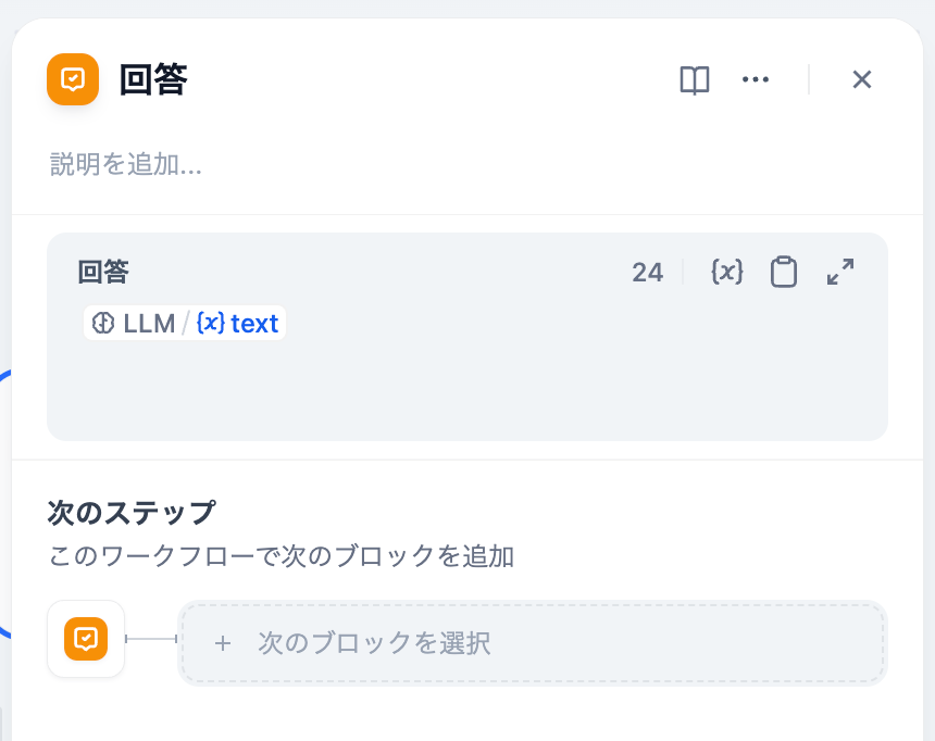 回答ブロックはLLMブロックに接続するとこのような内容になっているはずですので、そのままで大丈夫です。