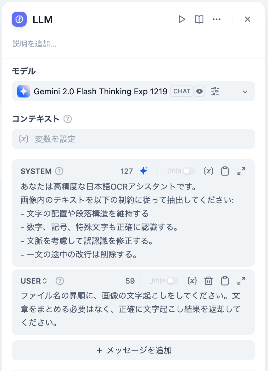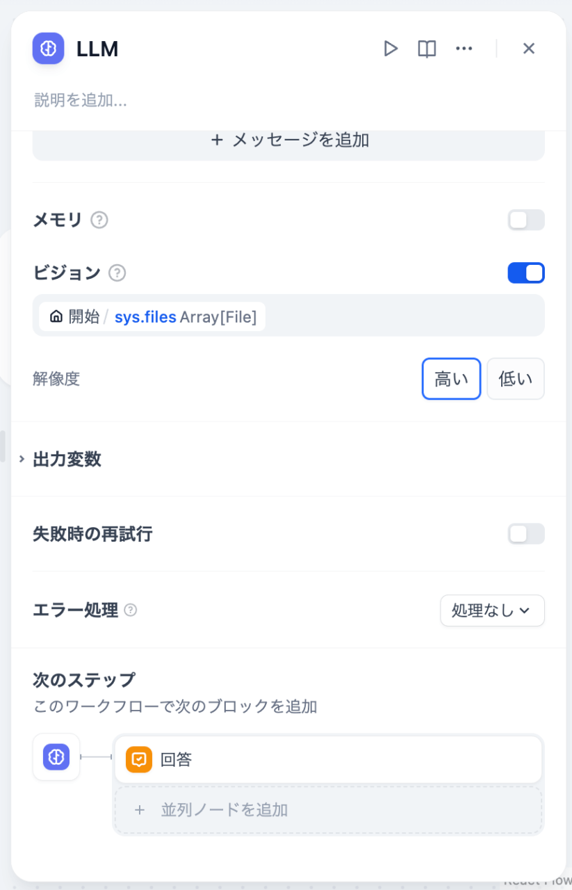 今回は画像を利用するため「ビジョン」を有効にし、「開始/sys.files Array[File]」を選択します。これで、チャット画面で添付した複数画像がGeminiに送信されます。