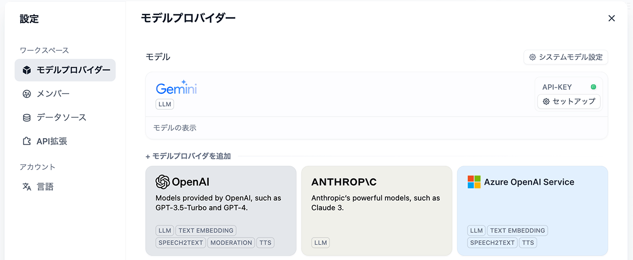 ここで色々な生成AIサービスを選択できます。今回はGoogle Geminiを設定します。