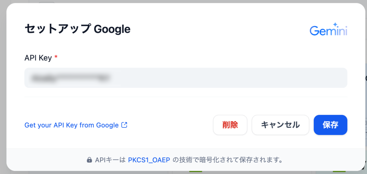 Google Geminiの場合は、事前にAPI KEYを取得(無料で取得可能)しておき、そのKEYを設定するのみです。