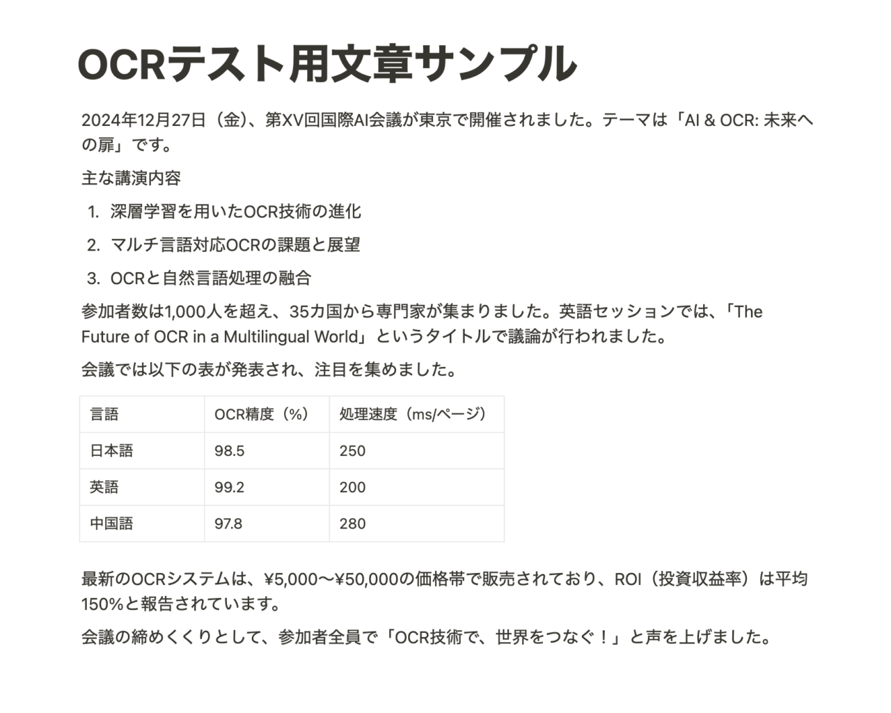日本語ベースで、英語、数字、記号、表を含むように指示をして生成した文章です。