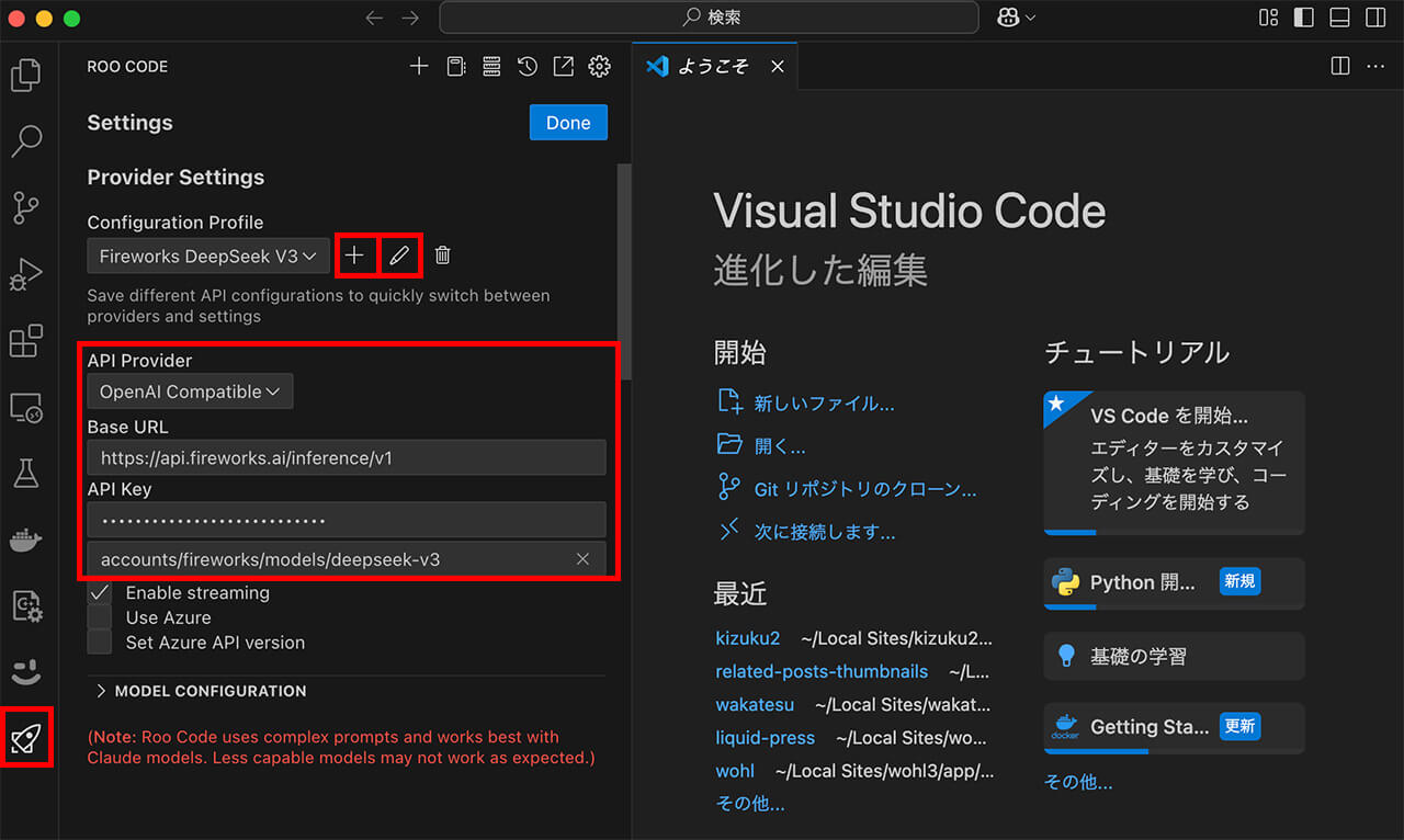 - Fireworks AIのAPIはOpenAI APIと互換があるため、様々なツールで活用できます。VS Codeの拡張機能(例:RooCode)をインストールし、Fireworks AIのAPI情報(URL、API Key、モデル名)を設定することで利用可能になります。これにより、VS Code内でFireworks AIのDeepSeekモデルや他のモデルを使用できます。