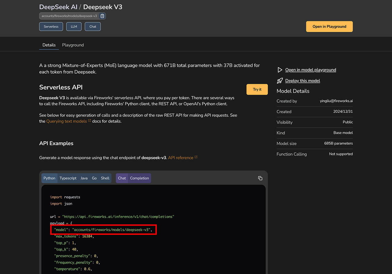 モデルを選択すると、サンプルコードが表示されます。Deepseek V3の場合は次のような画面となり、そこからモデル名を取得します。