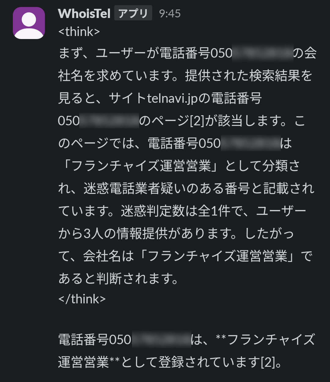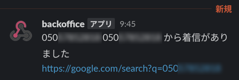 『電話番号 {phone_number} の会社名を教えてください。明確ではない場合には、相手不明と簡潔に回答してください。番号の属性・特徴などの解説は不要です。』 - AIサービスから返却された回答をSlackに送信する。