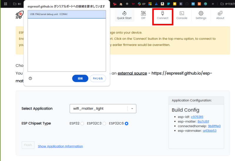 「Connect」をクリックし、ESP32が接続されているポートを選択して「接続」をクリックします。