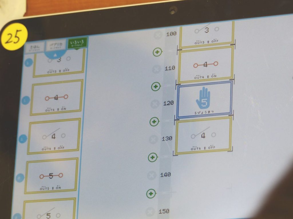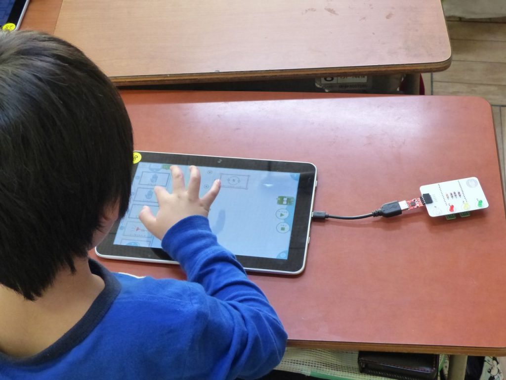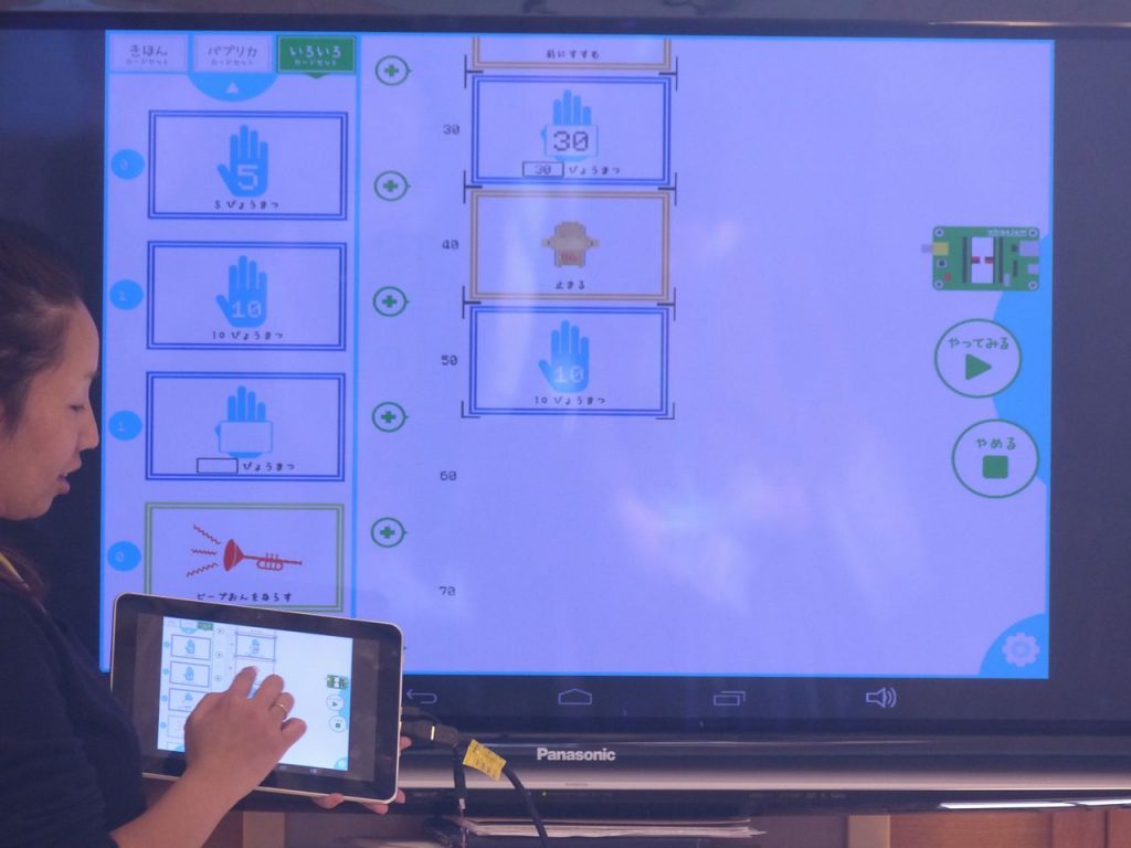 1年生からテキストベースは難しいため、IchigoJamをビジュアルでプログラミングできる「Cutlery Apps」というアプリをタブレットを使ってプログラミングし、その結果をIchigoJamで動作させて確認するという流れになっています。