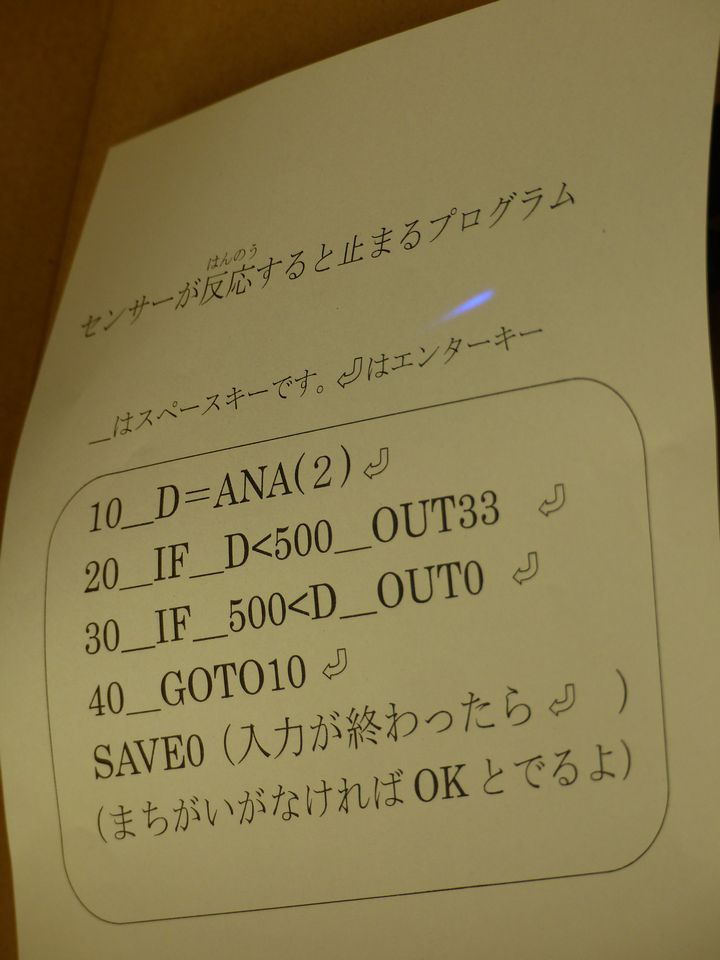 3年生はタミヤのロボット(カムプログラムロボット)とIchigoJamを使い、センサーで障害物を検知し停止するプログラミングにチャレンジしていました。