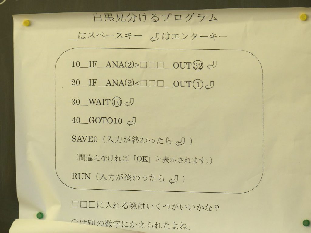 プログラミングコードの解説(まとめ)を先生が最後にされていましたが、センサーの「しきい値」という単語の説明等もあり、私自身が「閾値」なんて単語を知ったのは大学生の頃だったなぁと思いながら、聞いていました。