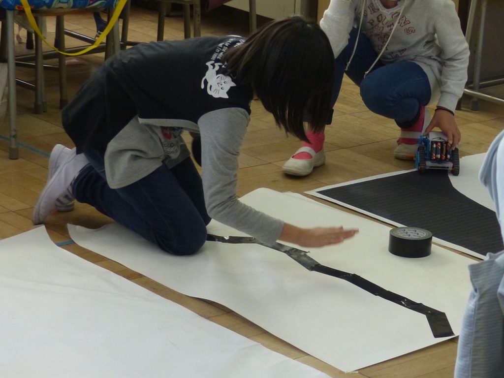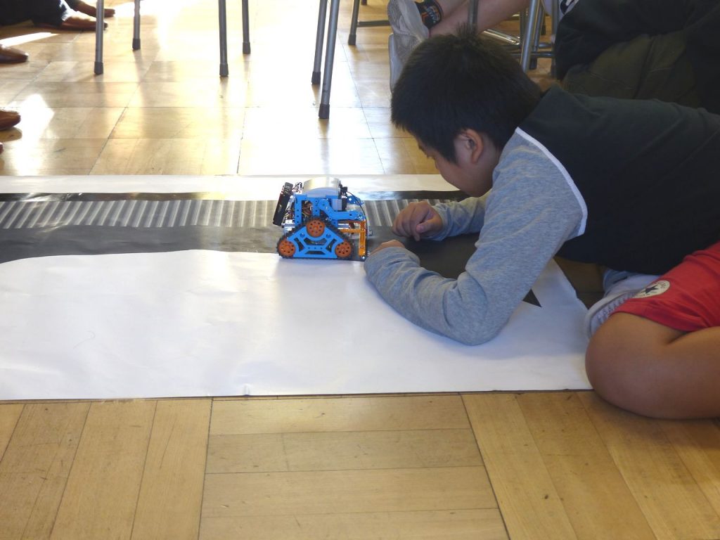 4年生もテキストベースでのライントレース(紙に書いた黒い線をたどるようロボットを動かす)にチャレンジしていました。