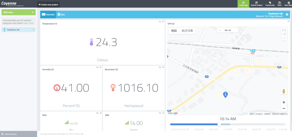 今回は、最終的にCayenneにてデータを表示します。そのため、DeviceからCayenneに対応したフォーマットでデータを送信する必要があります。LoRaWANでは1回に送信可能なデータサイズが限られるため、そのフォーマットも検討する必要がありますが、 Cayenneに対応したライブラリを利用すると簡単にフォーマットを整えることが可能です。
