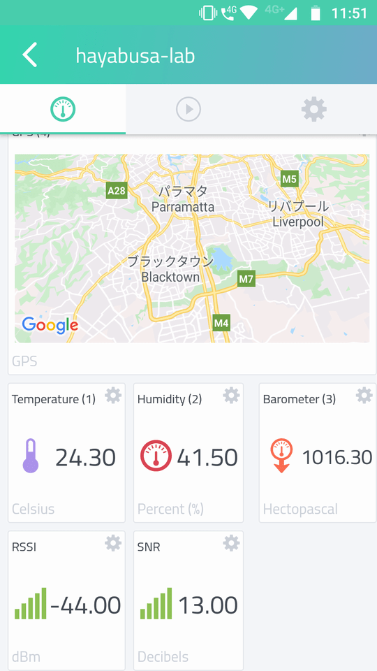 移動端末(Device)で収集したデータ(室温・湿度・気圧・GPS)をLoRaWAN通信でアップロードし、クラウドサービスを利用して可視化します。