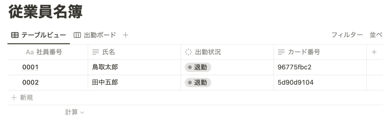 Notionには2つのデータベース(従業員名簿、出勤簿)を準備しました。