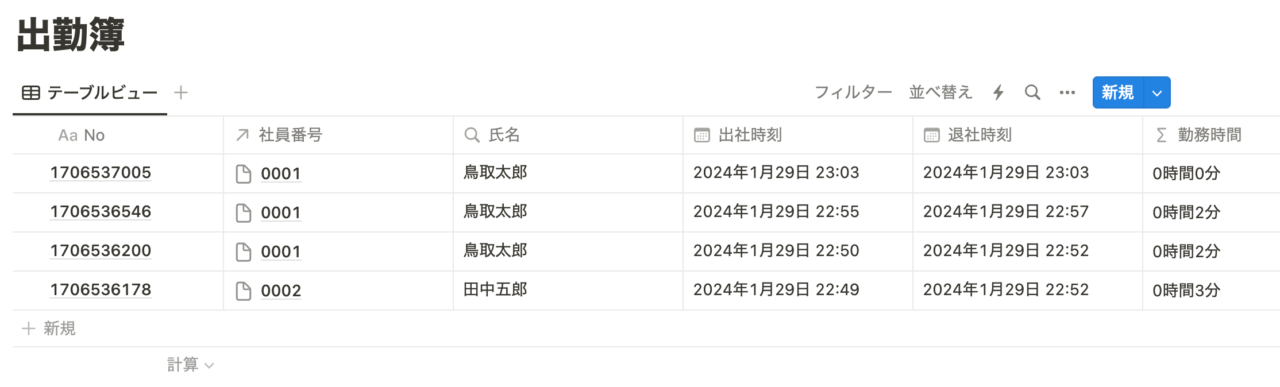 - Notionに登録されている従業員データベース(社員番号、氏名、カードID)を利用して、送信されたカードIDから従業員を特定する。
