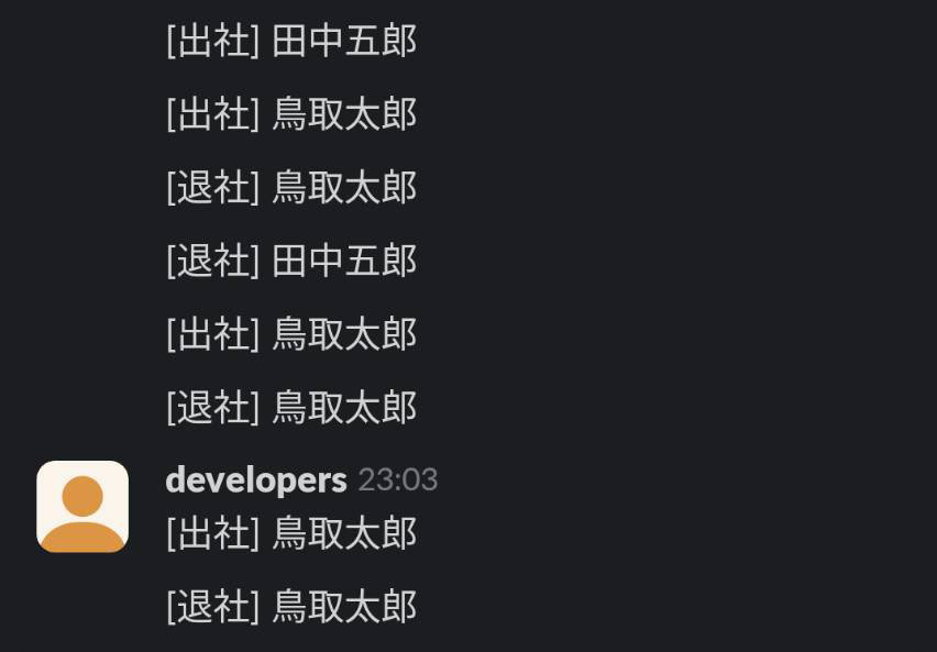 従業員が出勤・退勤した際にリアルタイムでSlackに通知します。