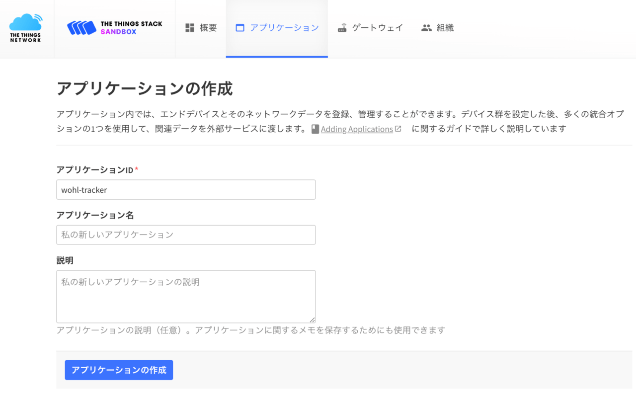 TTNのコンソール画面からアプリケーション画面に遷移し、画面右上の「アプリケーションの作成」ボタンをクリックします。