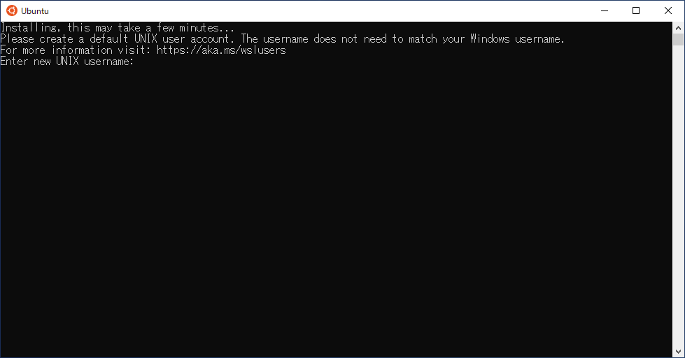 再起動後、Ubuntuの設定が自動的に行われており、Ubuntuのユーザー名・パスワードを設定するよう促される。