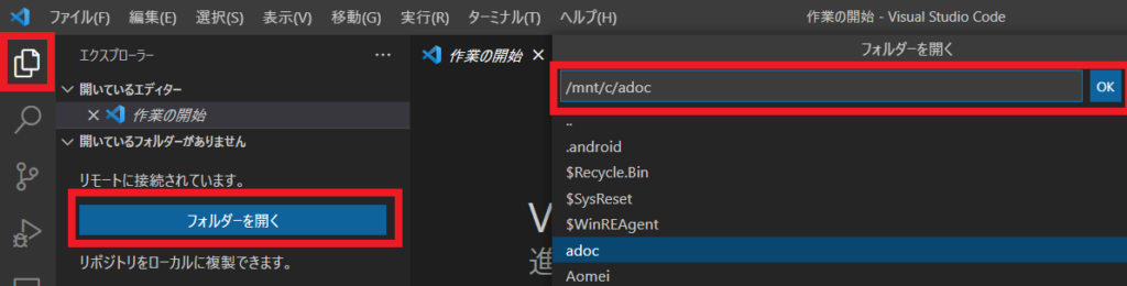 作業フォルダ C:\adocを開く。Ubuntuからは/mnt直下にcドライブがマウントされるため、「/mnt/c/adoc」を開く。