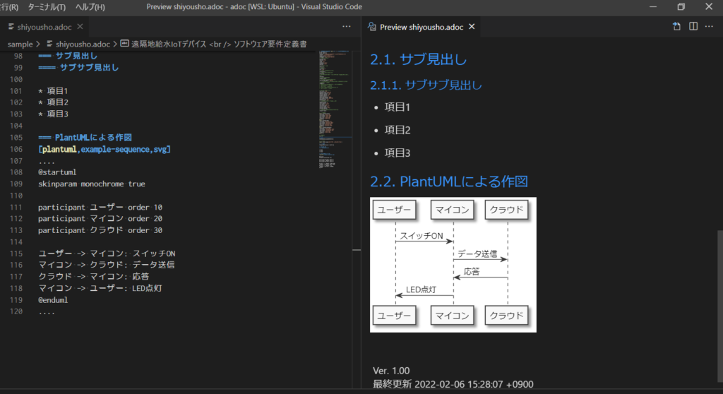 この設定により、AsciiDoc内にてPlantUML形式で図形(ダイアグラム)を記述することが可能になる。ただし、krokiサーバーは外部のサーバーであるため、記載した図形データが外部サーバーに送信され、変換された画像をダウンロードすることに注意が必要。社外秘の文書には利用不可。
