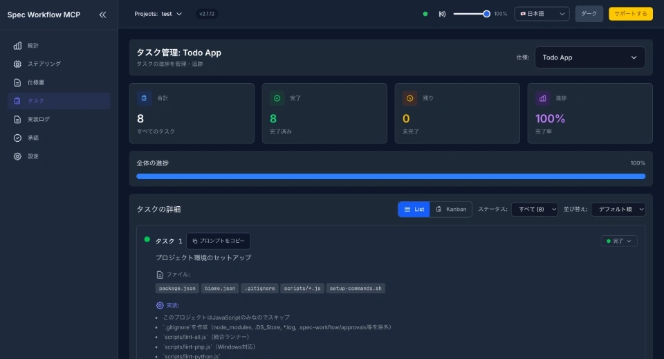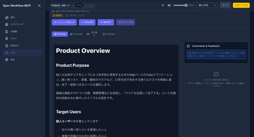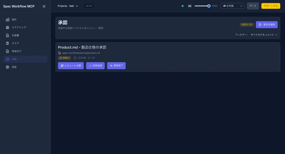 リアルタイム承認フロー: spec-workflow-mcpのWebダッシュボードを通じて、仕様書のレビューと承認をインタラクティブに実施できます。
