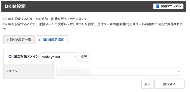 もし、一覧に対象ドメインが表示されない場合には、「DKIM設定追加」画面にてドメインを選択し、「設定する」をクリックします。