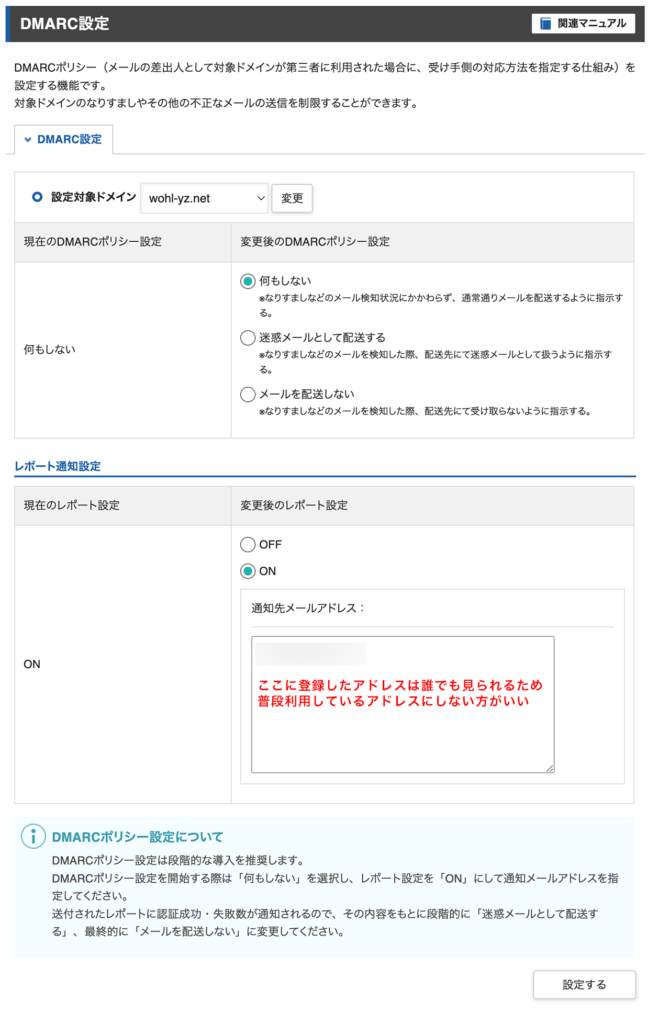 こちらもXserverにて自動的に設定されており、現在のDMARCポリシー設定「何もしない」、レポート通知設定「OFF」になっています。