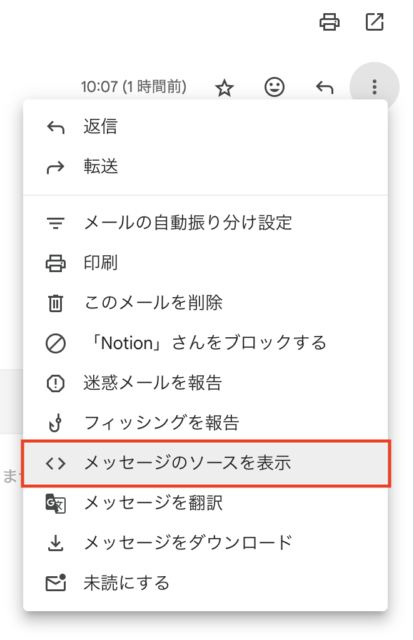 Gメールにて受信したメールを開き、画面右上の3点メニューをクリックし、「メッセージのソースを表示」をクリックします。