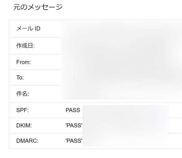 表示された画面のSPF、DKIM、DMARCが全てPASSになっていれば正常に設定できています。