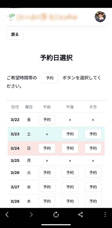予約可能日に「予約」ボタンが表示されるため、選択していただきます。
