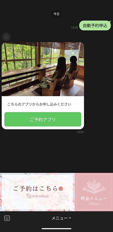 LINE公式アカウントのリッチメニューをタップすると、メッセージ「自動予約申込」が送信され、Messaging APIのWebフック機能によりサーバーから予約アプリを案内するメッセージが返信されます。