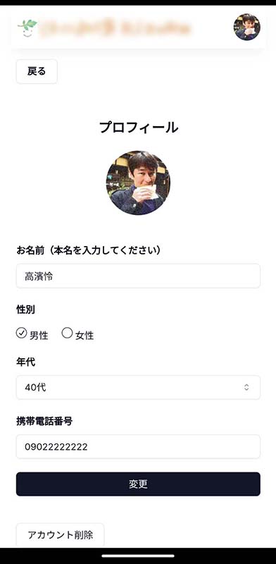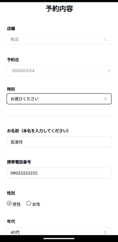 氏名、電話番号、性別、年代などプロフィール情報に登録のある情報はデフォルト値として入力されています。