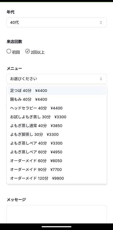 2回目以降のお客様は時刻とメニューのみ選択すれば予約可能です。