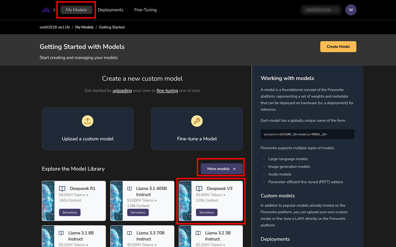 画面上部メニューの「My Models」をクリックし、「Deepseek V3」を選択します。他のモデルを利用する場合には、「More models」をクリックするとモデルの一覧が表示されます。モデルの中から「Serverless」対応のモデルを選択します。